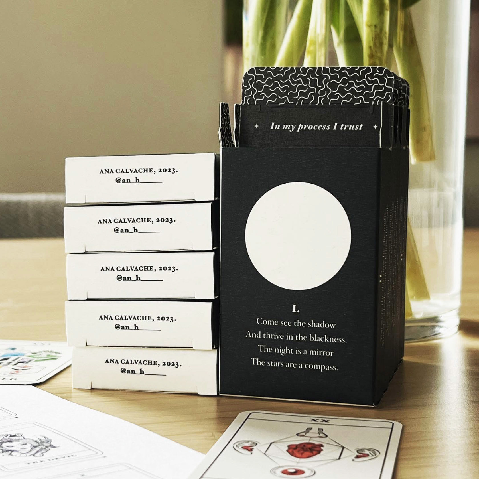 To make it cohesive, I added a moon symbol associated with my mother to the back of the cards. Then, for the box, I went minimalistic, prioritizing a poem that praises the acceptance of the shadow as the key to contentment.